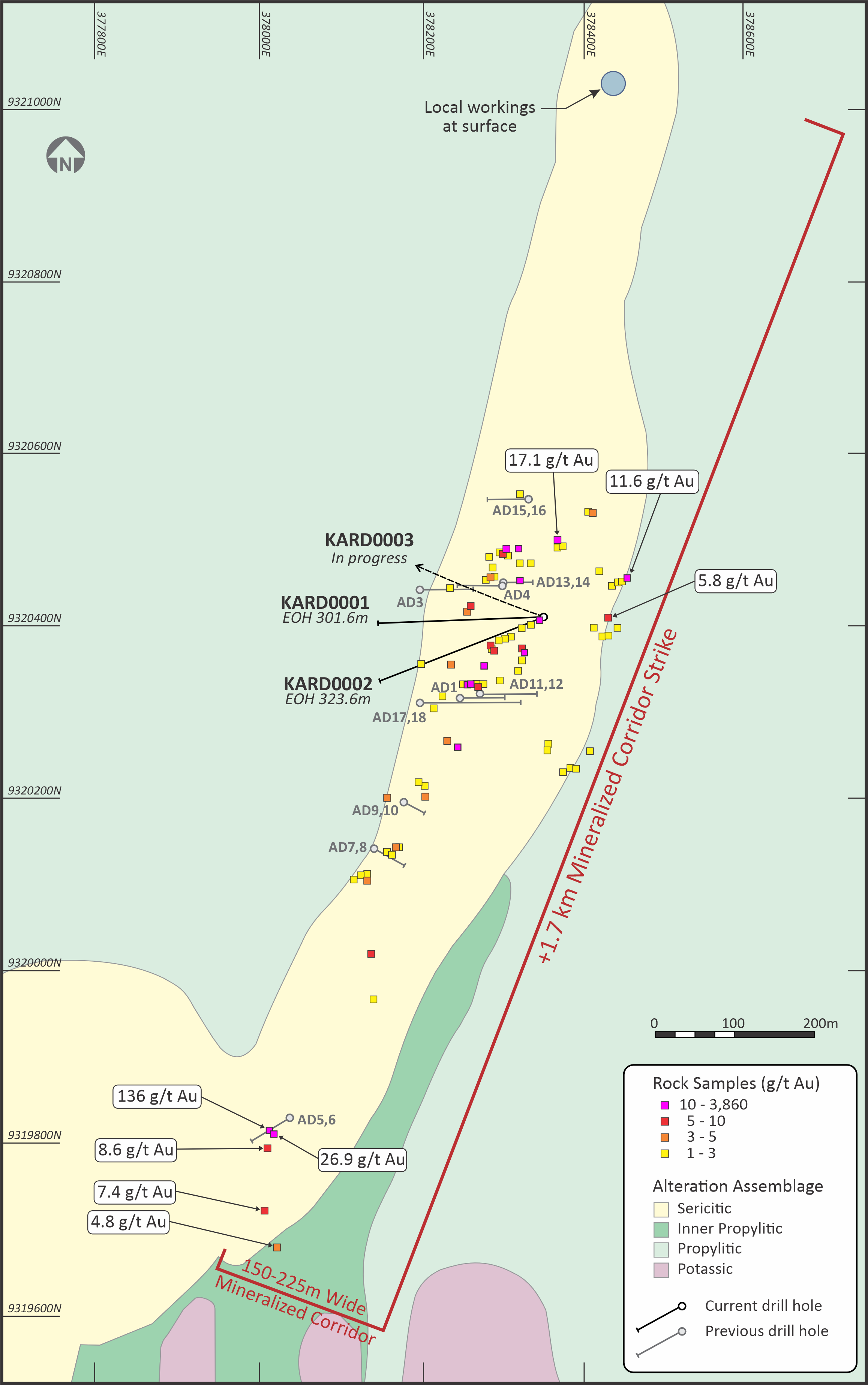 - Between the high grade lodes, the tonalite to dioritic host rock is overprinted with porphyry style mineralization increasing the potential for bulk mining. Hole KARDD0002 recorded a bulk intersection of 219.8 m at 1.59 g/t AuEq with a higher grade core of 149.4m at 2.12 g/t AuEq, starting at 5.2 m from surface (see Fig 1). Importantly, hole KARDD0002 drilled only approximately two-thirds of the width of the mineralized corridor, with the eastern one-third untested (see Fig 2-3).